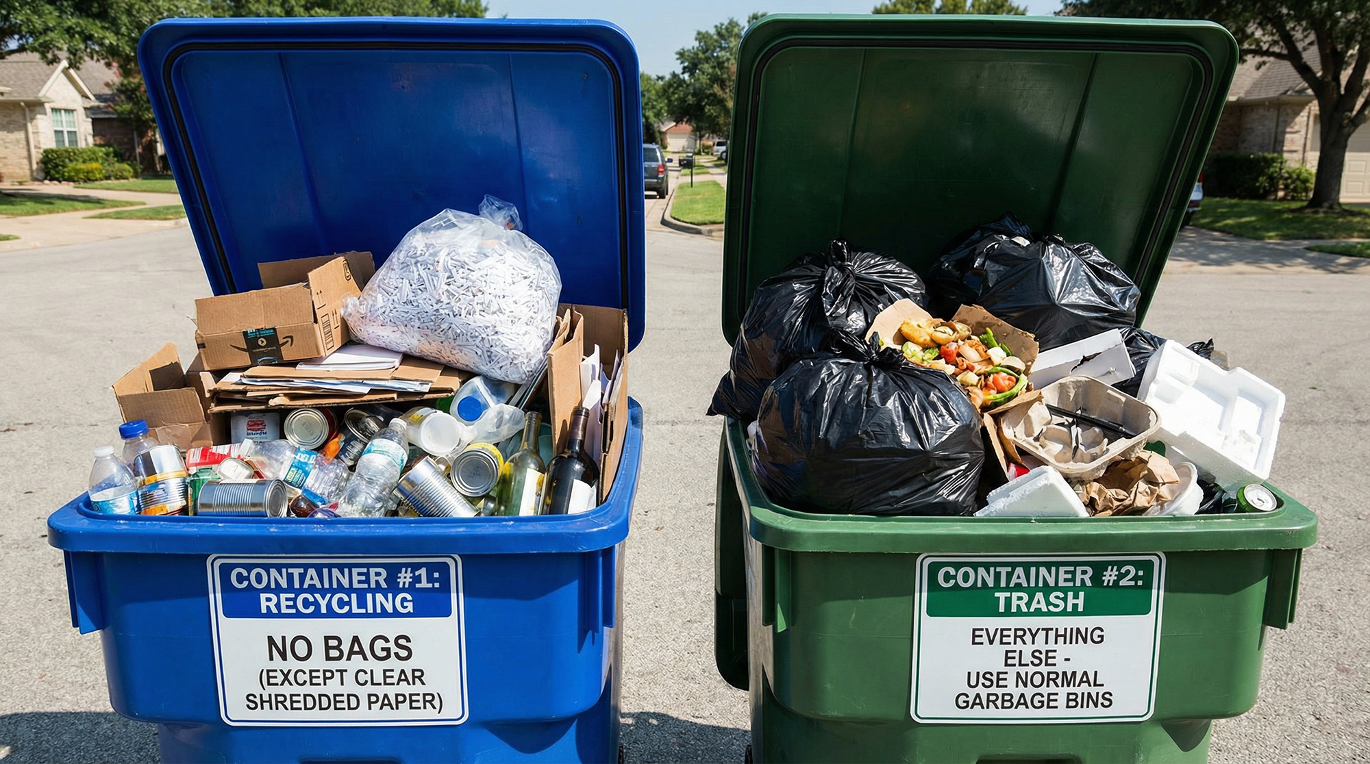 - Container #1 (Recycling): Paper, cardboard, plastic bottles and containers, metal cans, and glass bottles — all mixed together loosely, no bags (except clear bags for shredded paper)