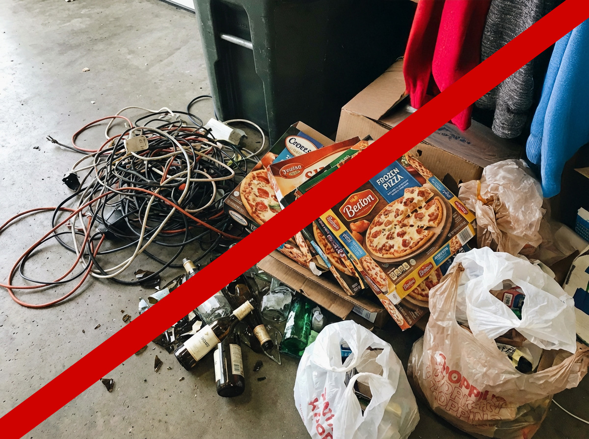 - Container #2 (Trash): Everything else, including food waste, Styrofoam, broken items, and contaminated materials