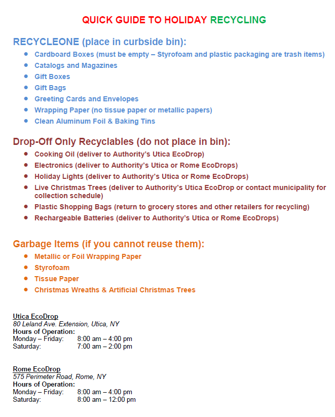 “Throughout each year, the Oneida-Herkimer Solid Waste Authority (Authority) offers various waste reduction and recycling programs to its residents. Due to the increased waste during the holiday season, the Authority offers reminders for proper disposal and recycling of holiday items so that residents can cut down on waste with ease, said Jamie Tuttle, Authority Recycling Educator.